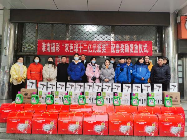 根據省福彩中心《關(guān)于做好雙色球十二億派獎活動(dòng)的通知》精神,為激勵淮南市廣大福彩站主及銷(xiāo)售員,從而進(jìn)一步擴大彩民群體,提升福彩品牌影響力,淮南市福彩中心在全市范圍內開(kāi)展了“雙色球十二億元派獎”淮南福彩配套活動(dòng)。本次配套活動(dòng)開(kāi)展與中福彩中心“十二億派獎”活動(dòng)同步開(kāi)展至結束,活動(dòng)期內雙色球銷(xiāo)量前15名福彩銷(xiāo)售站點(diǎn),每名獎勵約600元生活用品禮包。1月6日上午,在淮南市福彩中心一樓大廳門(mén)前舉行了發(fā)獎儀式,