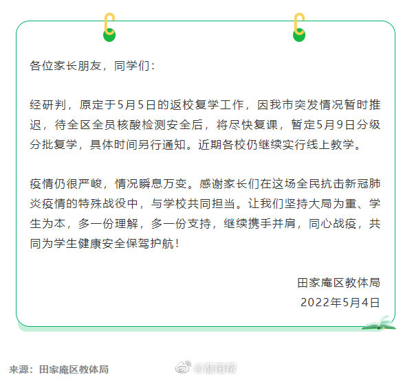 經(jīng)研判,原定于5月5日的返校復學(xué)工作,因淮南市突發(fā)情況暫時(shí)推遲,待全區全員核酸檢測安全后,將盡快復課,暫定5月9日分級分批復學(xué),具體時(shí)間另行通知。近期各校仍繼續實(shí)行線(xiàn)上教學(xué)。