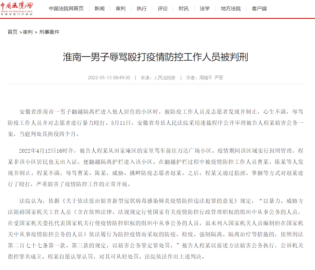 安徽省淮南市一男子翻越隔離欄進(jìn)入他人居住的小區時(shí),防疫工作人員及志愿者發(fā)現并制止,心生不滿(mǎn),辱罵防疫工作人員并對志愿者進(jìn)行暴力毆打。5月11日,安徽省壽縣人民法院采用速裁程序公開(kāi)審理被告人程某妨害公務(wù)一案,當庭判處其拘役四個(gè)月。